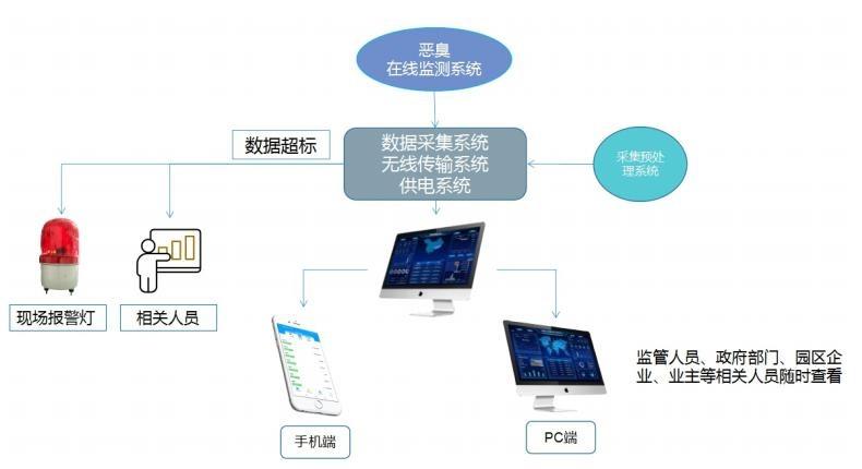 环境空气采样→多级预处理净化→传感器阵列气体识别与信号采集→算法解析换算臭气浓度(OU)+ 单一特征污染物浓度→本地实时显示、数据存储→网络上传环保平台→超标自动多级预警→结合气象参数完成污染溯源分析。